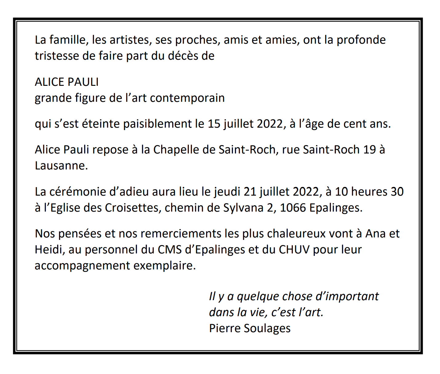 ALICE PAULI 13 jan. 1922 - 15 juil. 2022 Avis mortuaire PFG Télecharger PDF Partager sur: Galerie PreviousNext PreviousNext