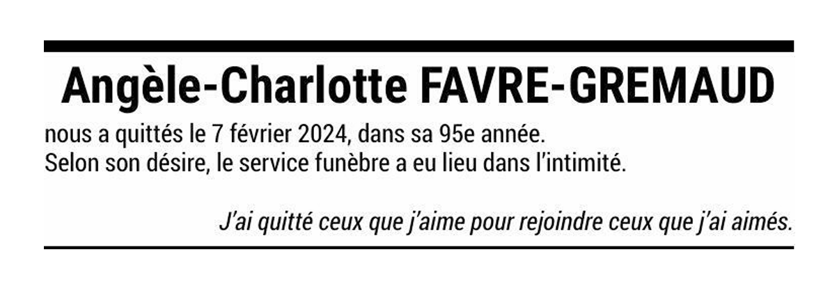 Angèle-Charlotte FAVRE-GREMAUD 22 sep. 1929 - 07 fév. 2024 Avis mortuaire PFG Télecharger PDF Partager sur: Galerie PreviousNext PreviousNext