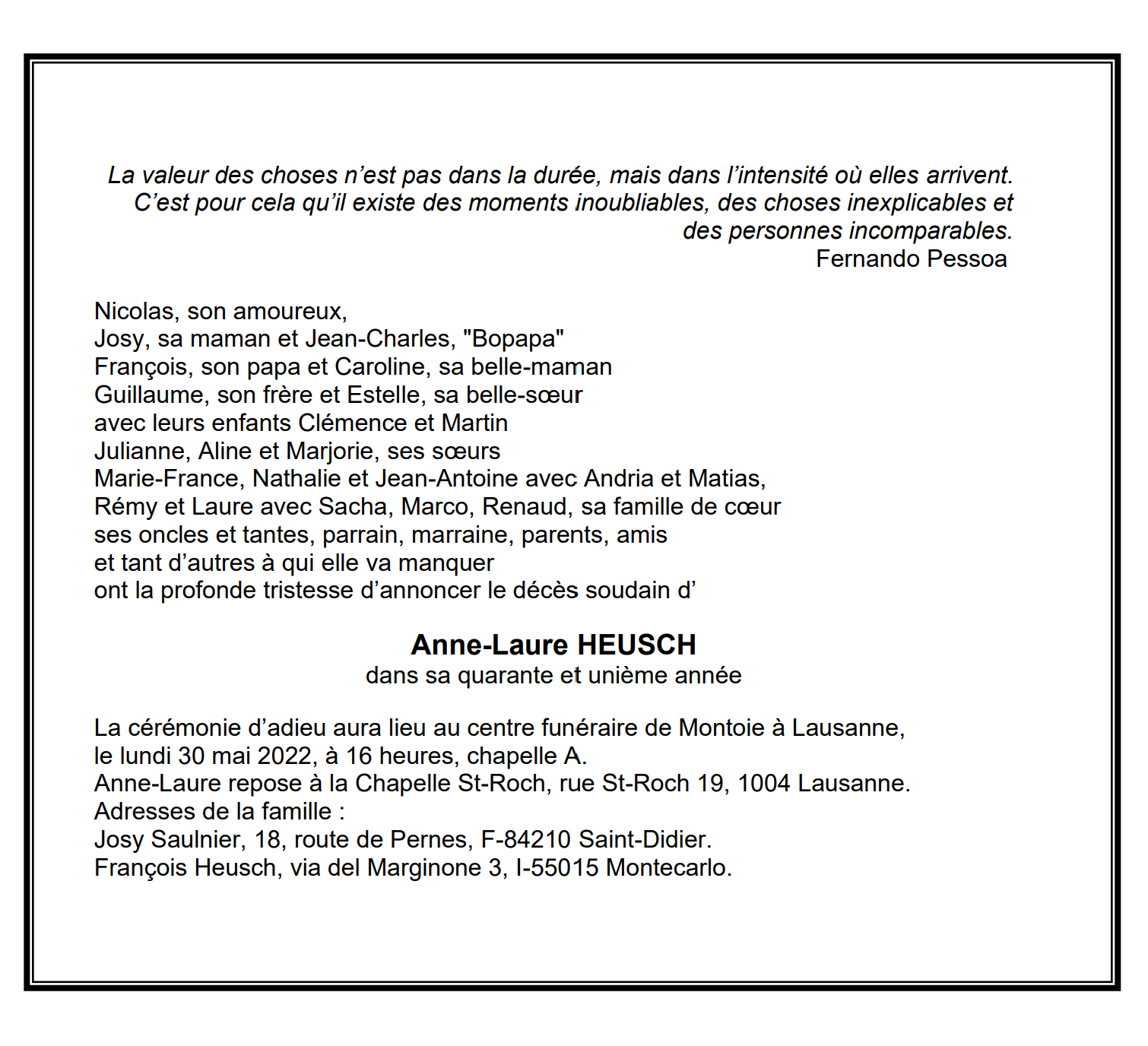 Anne-Laure HEUSCH 16 oct. 1981 - 16 mai. 2022 Avis mortuaire PFG Partager sur: Galerie PreviousNext PreviousNext