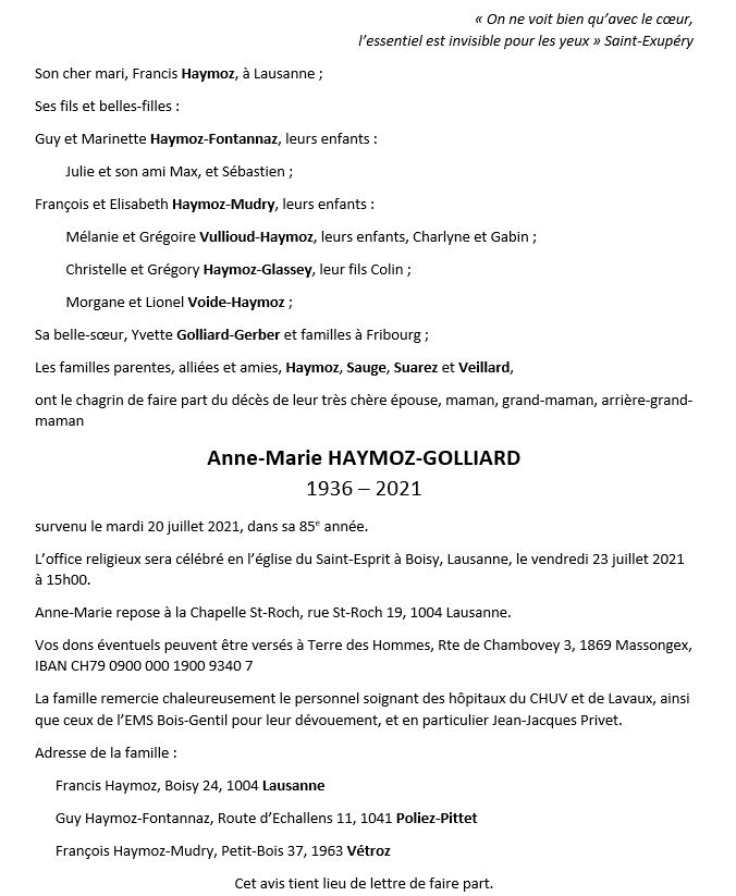 Anne-Marie HAYMOZ-GOLLIARD 07 déc. 1936 - 21 juil. 2021 Avis mortuaire PFG Télecharger PDF Partager sur: Galerie PreviousNext PreviousNext