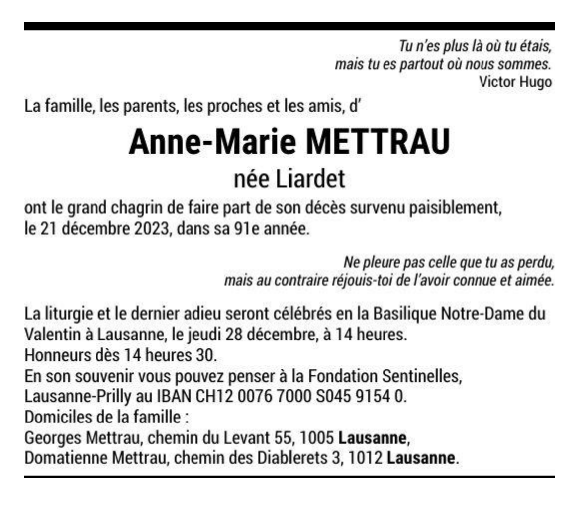 Anne-Marie METTRAU, née Liardet 23 oct. 1933 - 21 déc. 2023 Avis mortuaire PFG Télecharger PDF Partager sur: Galerie PreviousNext PreviousNext