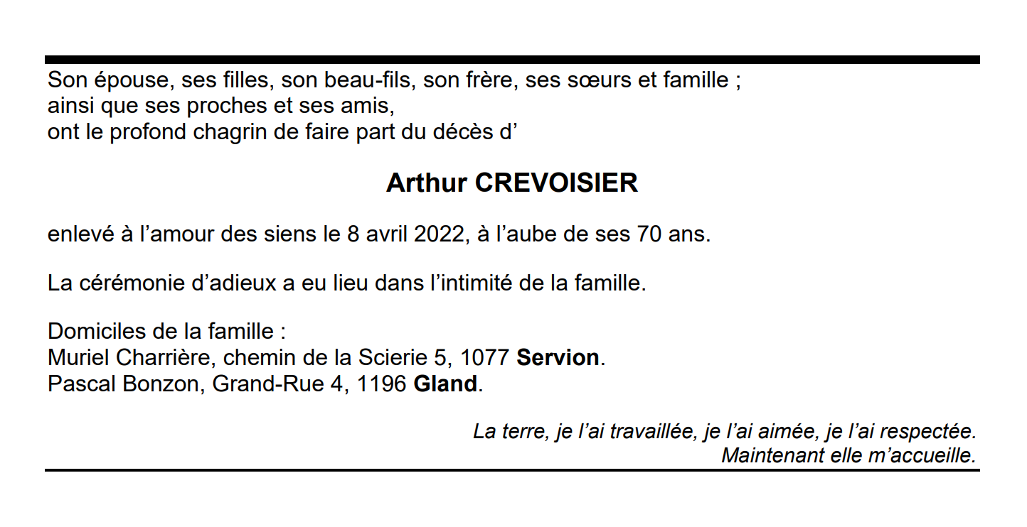 Arthur CREVOISIER 06 juin. 1952 - 08 avr. 2022 Avis mortuaire PFG Télecharger PDF Partager sur: Galerie PreviousNext PreviousNext