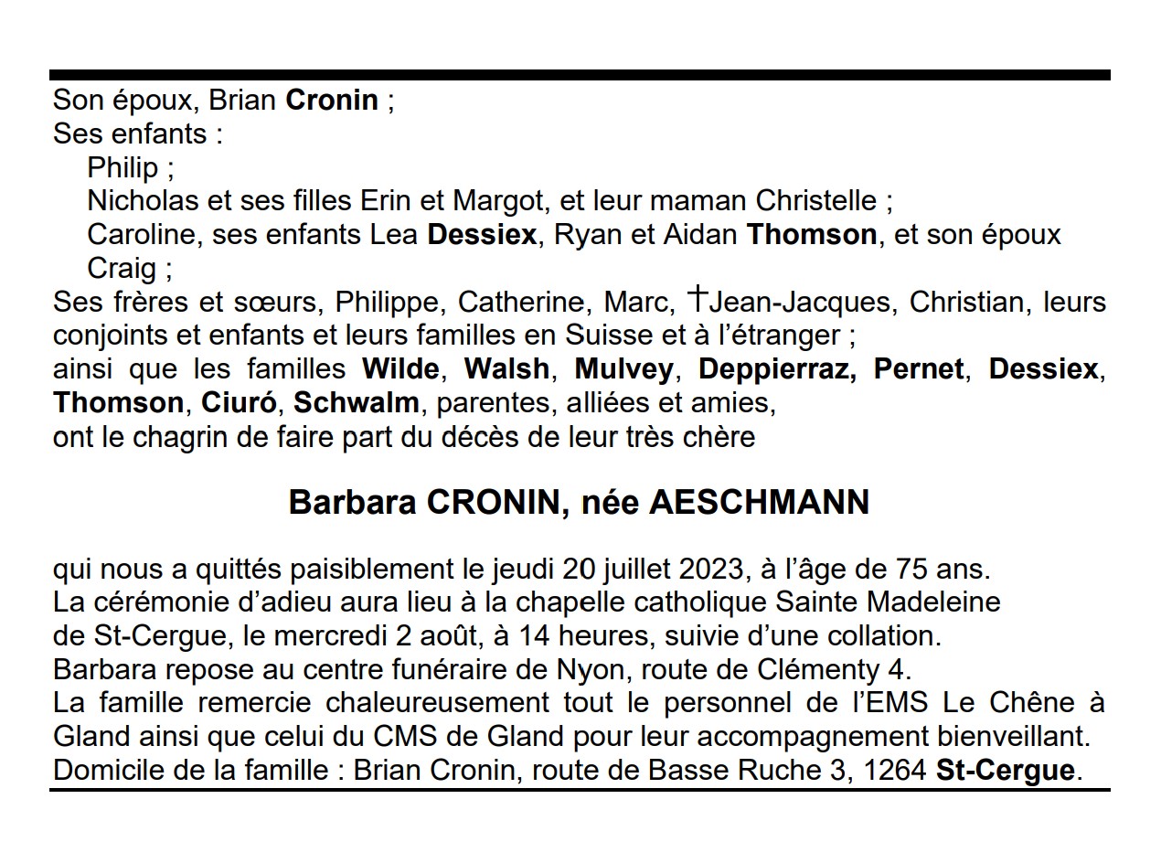 Barbara CRONIN, née AESCHMANN 29 juin. 1948 - 20 juil. 2023 Avis mortuaire PFG Télecharger PDF Partager sur: Galerie PreviousNext PreviousNext