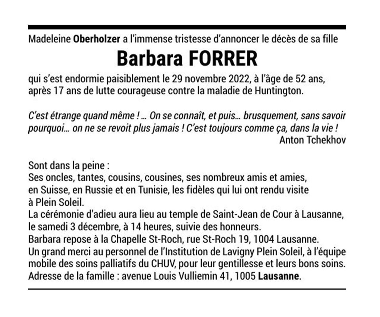 Barbara FORRER 19 sep. 1970 - 29 nov. 2022 Avis mortuaire PFG Télecharger PDF Partager sur: Galerie PreviousNext PreviousNext