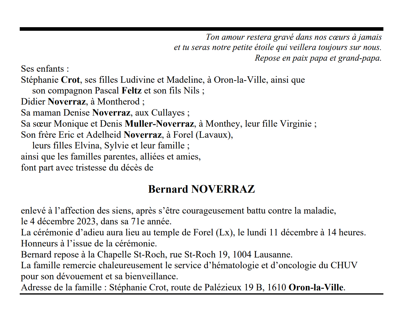 Bernard NOVERRAZ 13 fév. 1953 - 04 déc. 2023 Avis mortuaire PFG Télecharger PDF Partager sur: Galerie PreviousNext PreviousNext