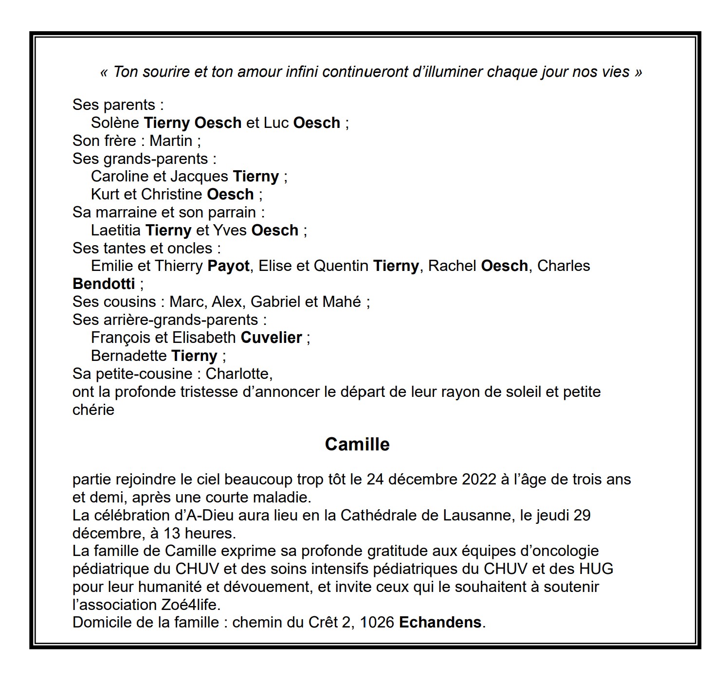Camille 27 mai. 2019 - 24 déc. 2022 Avis mortuaire PFG Télecharger PDF Partager sur: Galerie PreviousNext PreviousNext