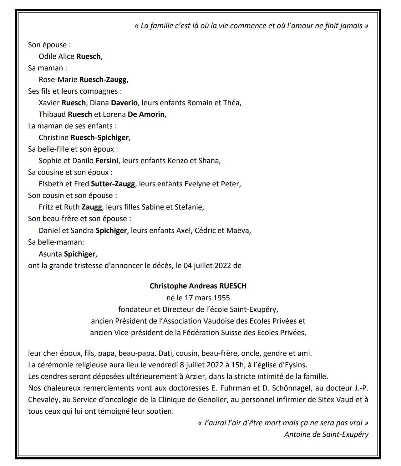 Christophe Andreas RUESCH 17 mar. 1955 - 04 juil. 2022 Avis mortuaire PFG Télecharger PDF Partager sur: Galerie PreviousNext PreviousNext