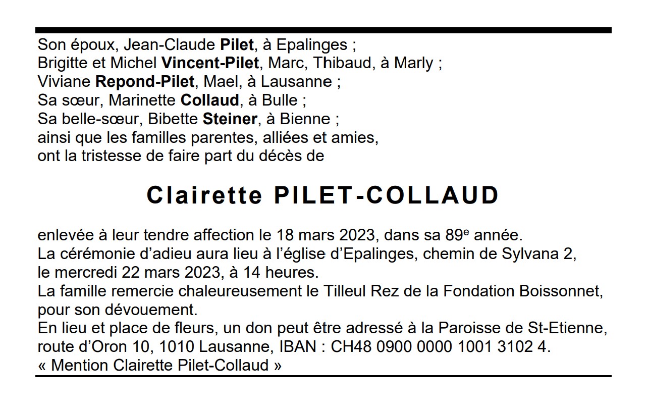 Clairette PILET-COLLAUD 01 juin. 1934 - 18 mar. 2023 Avis mortuaire PFG Télecharger PDF Partager sur: Galerie PreviousNext PreviousNext