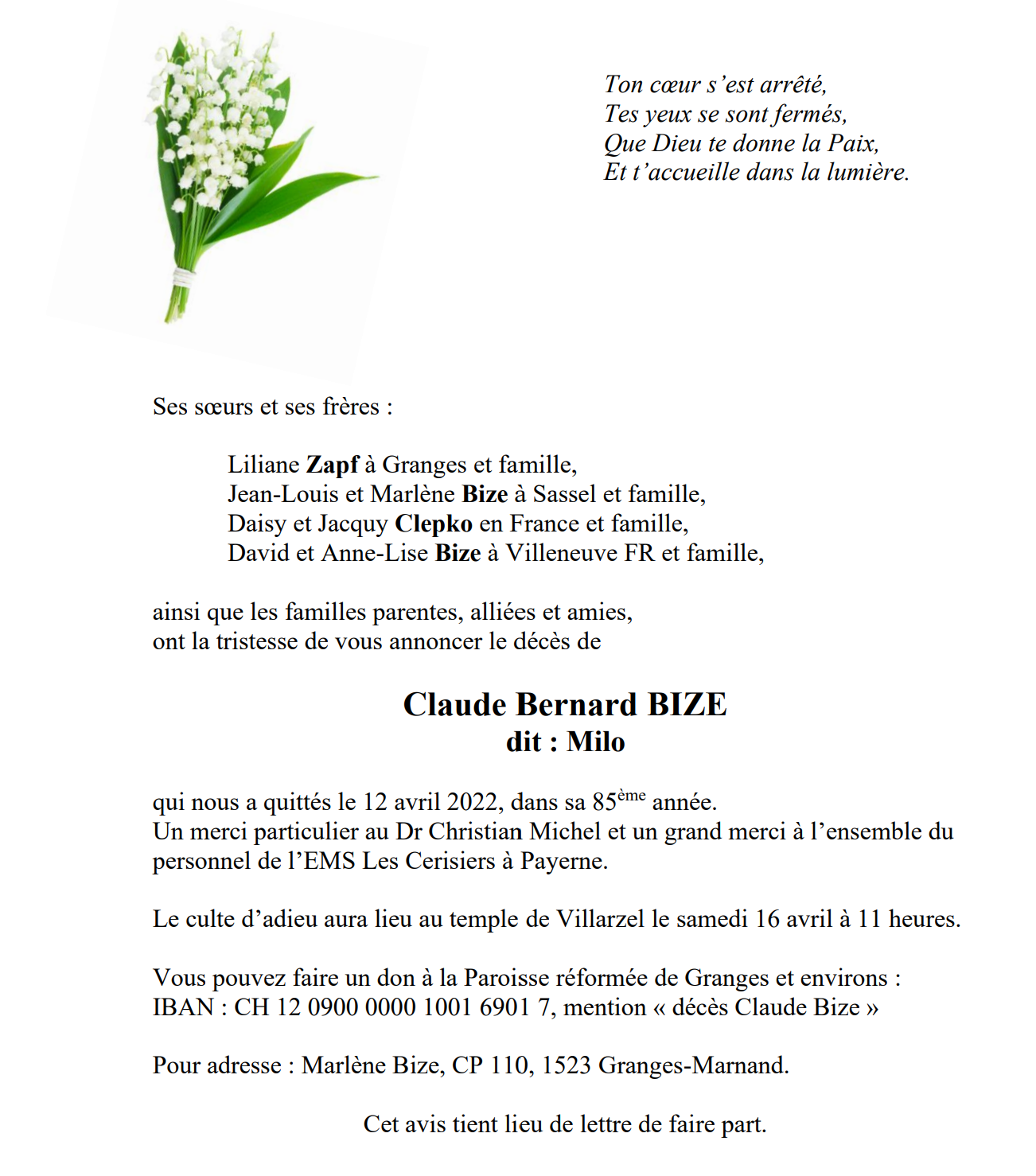 Claude Bernard BIZE 01 mar. 1938 - 12 avr. 2022 Avis mortuaire PFG Télecharger PDF Partager sur: Galerie PreviousNext PreviousNext