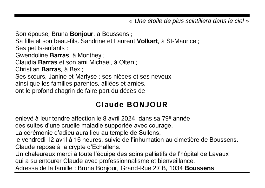 Claude BONJOUR 03 aoû. 1945 - 08 avr. 2024 Avis mortuaire PFG Télecharger PDF Partager sur: Galerie PreviousNext PreviousNext