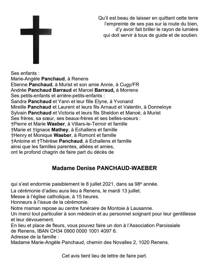 Denise PANCHAUD 03 nov. 1923 - 08 juil. 2021 Avis mortuaire PFG Télecharger PDF Partager sur: Galerie PreviousNext PreviousNext