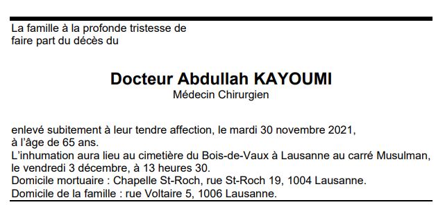 Docteur Abdullah KAYOUMI 10 nov. 1956 - 30 déc. 2021 Avis mortuaire PFG Télecharger PDF Partager sur: Galerie PreviousNext PreviousNext