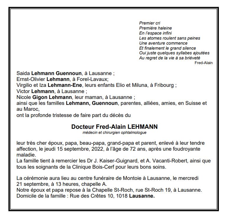 Docteur Fred-Alain LEHMANN 14 jan. 1950 - 15 sep. 2022 Avis mortuaire PFG Télecharger PDF Partager sur: Galerie PreviousNext PreviousNext