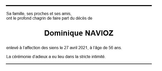 Dominique NAVIOZ 24 oct. 1964 - 27 avr. 2021 Avis mortuaire PFG Télecharger PDF Partager sur: Galerie PreviousNext PreviousNext