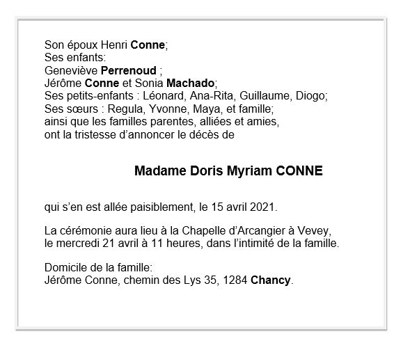 Doris Myriam CONNE 20 mar. 1944 - 15 avr. 2021 Avis mortuaire PFG Télecharger PDF Partager sur: Galerie PreviousNext PreviousNext