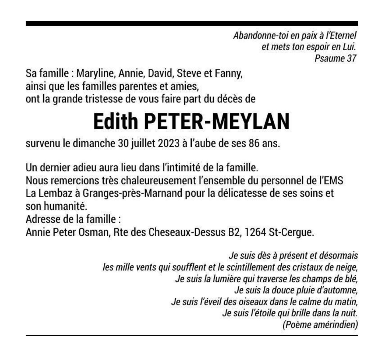 Edith PETER-MEYLAN 10 aoû. 1937 - 30 juil. 2023 Avis mortuaire PFG Télecharger PDF Partager sur: Galerie PreviousNext PreviousNext