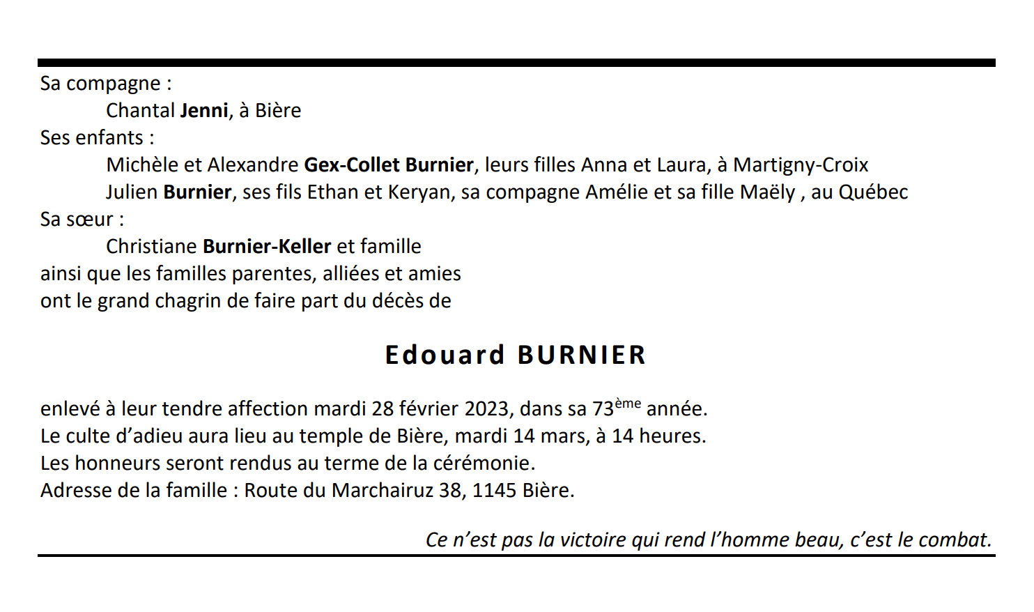 Edouard BURNIER 09 mai. 1950 - 28 fév. 2023 Avis mortuaire PFG Télecharger PDF Partager sur: Galerie PreviousNext PreviousNext