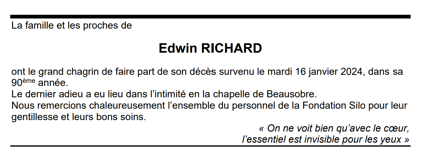 Edwin RICHARD 09 juin. 1934 - 16 jan. 2024 Avis mortuaire PFG Télecharger PDF Partager sur: Galerie PreviousNext PreviousNext