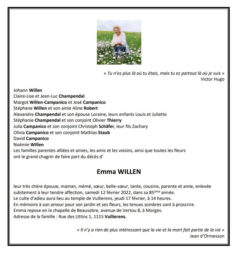 Emma WILLEN 31 aoû. 1937 - 12 fév. 2022 Avis mortuaire PFG Télecharger PDF Partager sur: Galerie PreviousNext PreviousNext