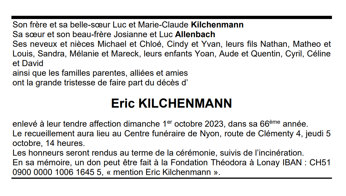 Eric KILCHENMANN 03 nov. 1957 - 01 oct. 2023 Avis mortuaire PFG Télecharger PDF Partager sur: Galerie PreviousNext PreviousNext