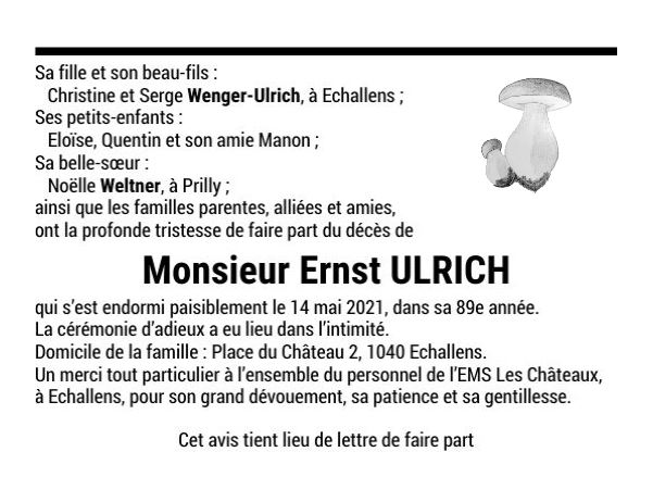 Ernst ULRICH 04 sep. 1932 - 14 mai. 2021 Avis mortuaire PFG Télecharger PDF Partager sur: Galerie PreviousNext PreviousNext