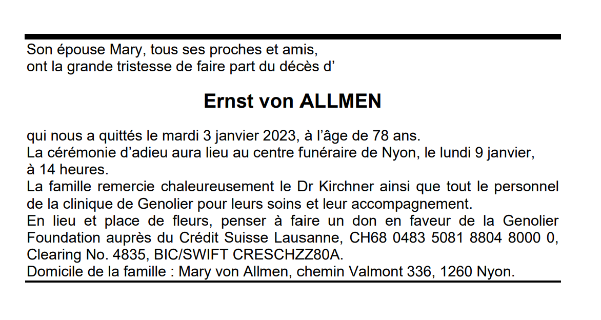 Ernst von ALLMEN 07 nov. 1944 - 03 jan. 2023 Avis mortuaire PFG Télecharger PDF Partager sur: Galerie PreviousNext PreviousNext