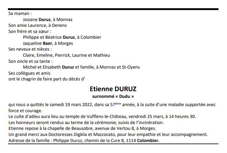 Etienne DURUZ 09 nov. 1965 - 19 mar. 2022 Avis mortuaire PFG Télecharger PDF Partager sur: Galerie PreviousNext PreviousNext