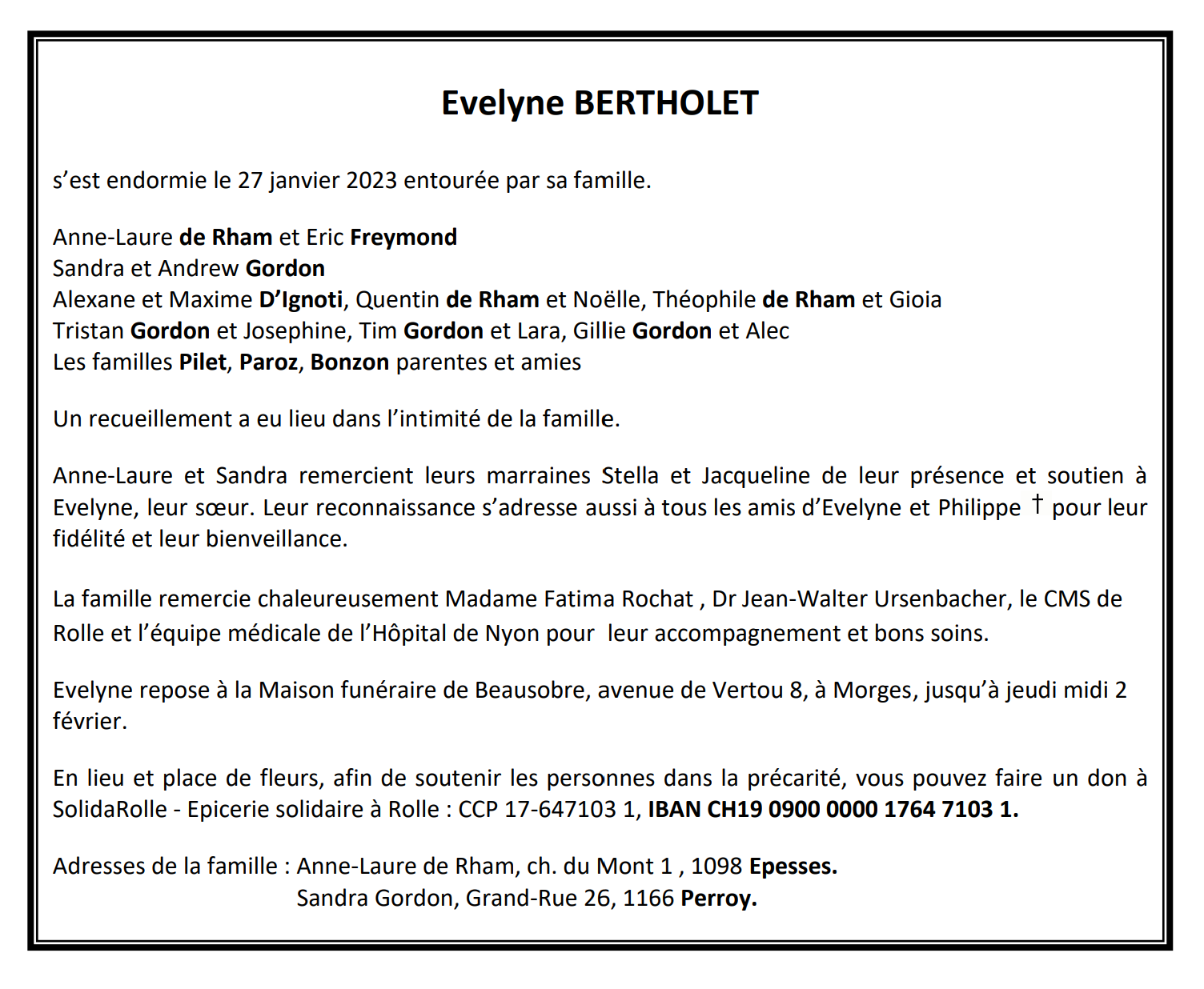 Evelyne BERTHOLET 20 juin. 1938 - 27 jan. 2023 Avis mortuaire PFG Télecharger PDF Partager sur: Galerie PreviousNext PreviousNext