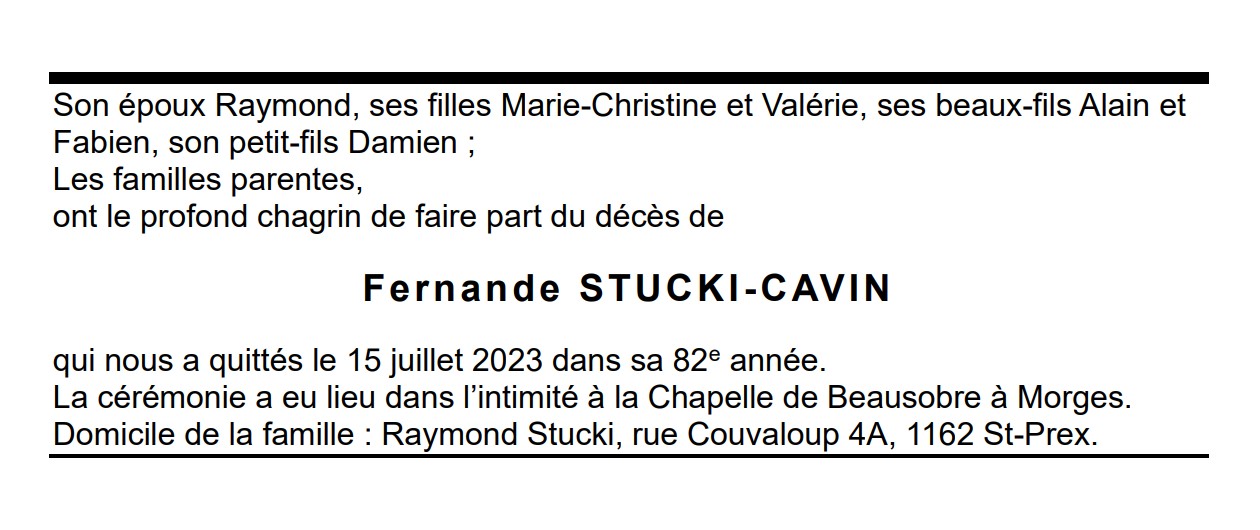Fernande STUCKI-CAVIN 09 nov. 1941 - 15 juil. 2023 Avis mortuaire PFG Télecharger PDF Partager sur: Galerie PreviousNext PreviousNext