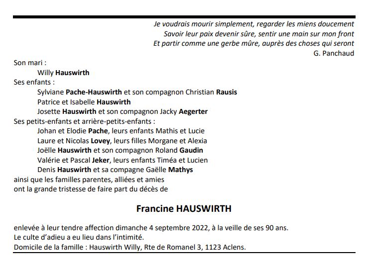 Francine HAUSWIRTH 14 sep. 1932 - 04 sep. 2022 Avis mortuaire PFG Télecharger PDF Partager sur: Galerie PreviousNext PreviousNext