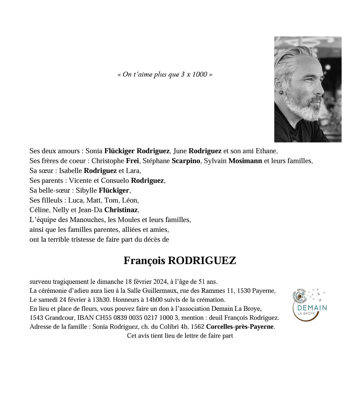François RODRIGUEZ 03 oct. 1972 - 18 fév. 2024 Avis mortuaire PFG Télecharger PDF Partager sur: Galerie