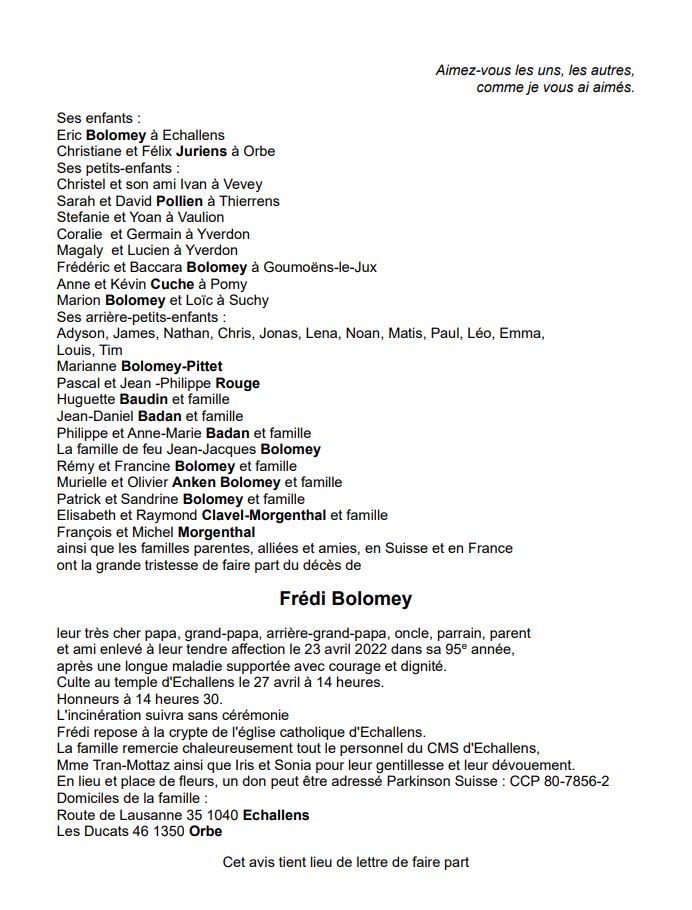 Frédi Bolomey 24 mai. 1927 - 24 avr. 2022 Avis mortuaire PFG Télecharger PDF Partager sur: Galerie PreviousNext PreviousNext