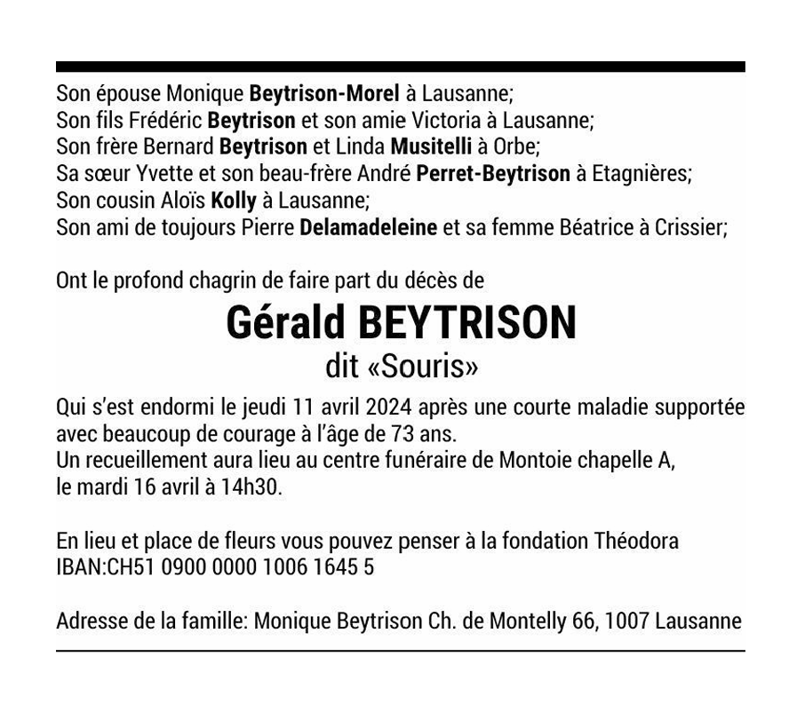 Gérald BEYTRISON 27 mai. 1951 - 11 avr. 2024 Avis mortuaire PFG Télecharger PDF Partager sur: Galerie PreviousNext PreviousNext