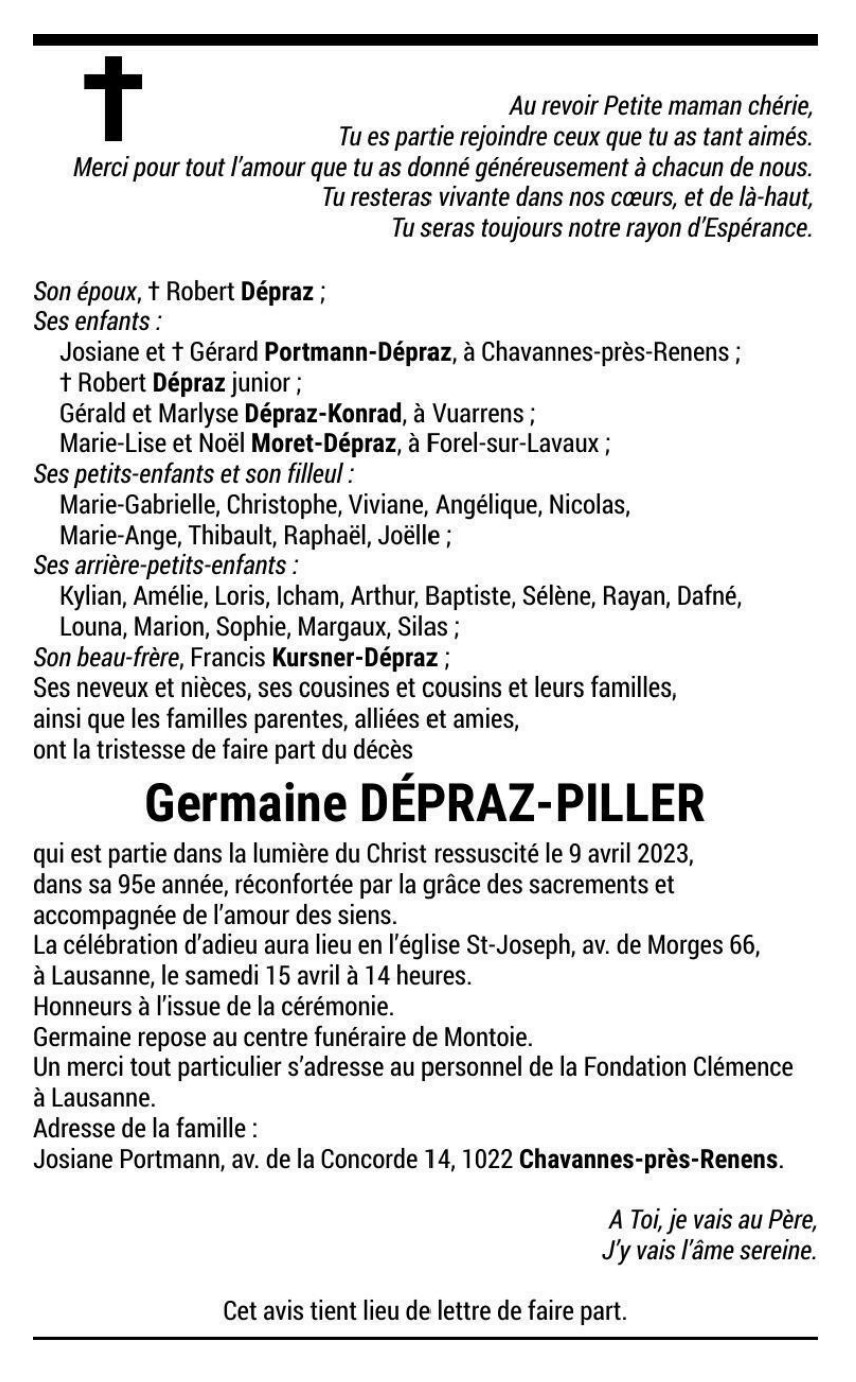 Germaine DÉPRAZ-PILLER 19 oct. 1928 - 09 avr. 2023 Avis mortuaire PFG Télecharger PDF Partager sur: Galerie PreviousNext PreviousNext