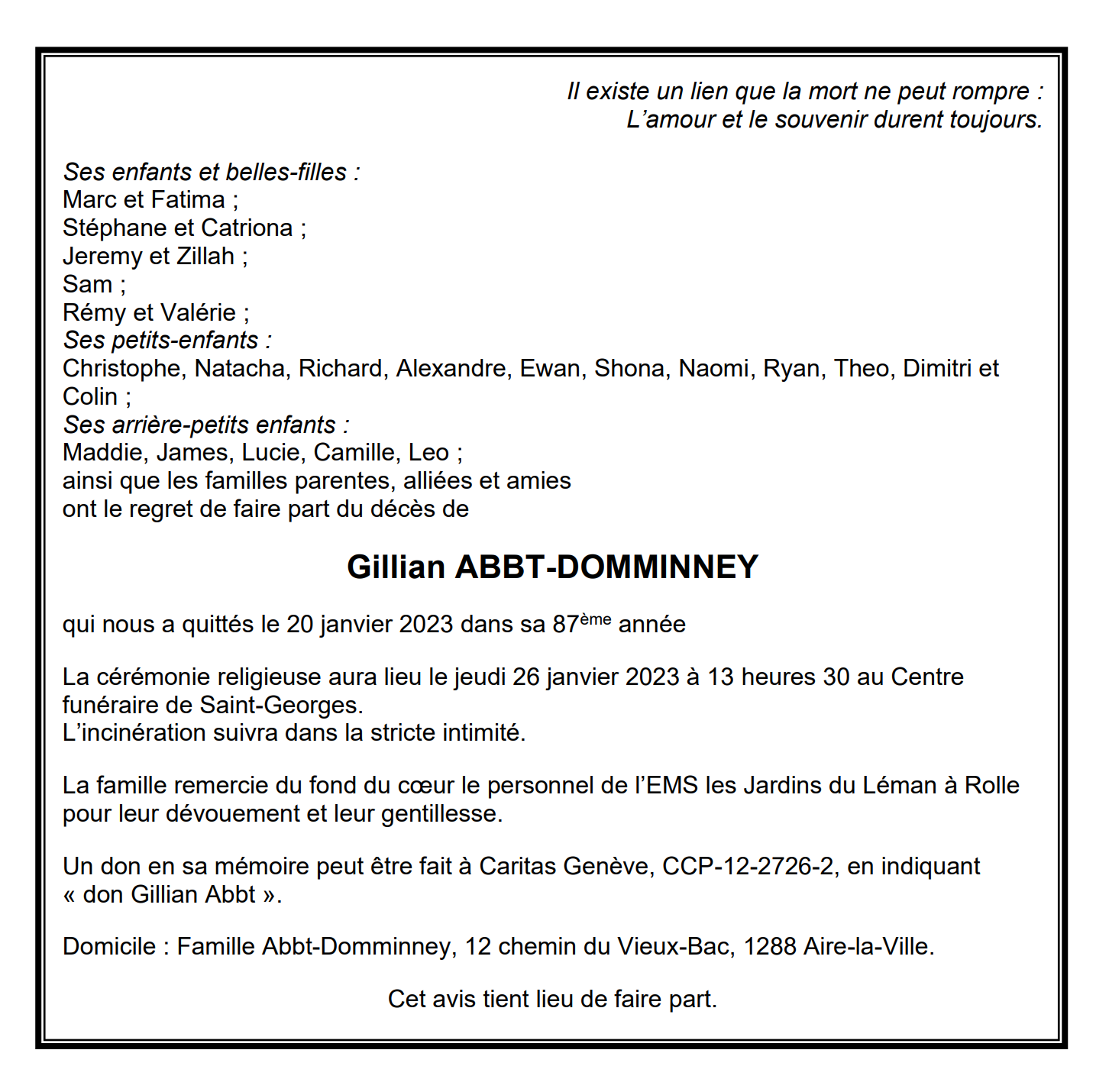 Gillian ABBT-DOMMINNEY 16 aoû. 1936 - 20 jan. 2023 Avis mortuaire PFG Télecharger PDF Partager sur: Galerie PreviousNext PreviousNext