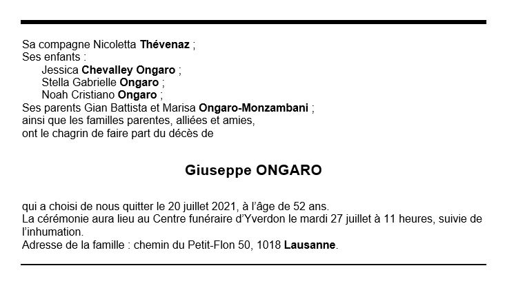 Giuseppe ONGARO 22 mai. 1969 - 20 juil. 2021 Avis mortuaire PFG Télecharger PDF Partager sur: Galerie PreviousNext PreviousNext
