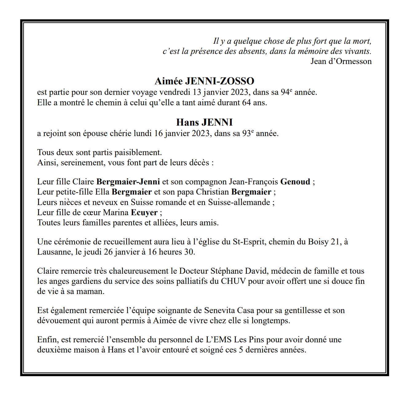 Hans JENNI 17 aoû. 1930 - 16 jan. 2023 Avis mortuaire PFG Télecharger PDF Partager sur: Galerie PreviousNext PreviousNext
