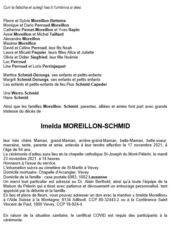 Imelda MOREILLON-SCHMID 26 juin. 1927 - 17 nov. 2021 Avis mortuaire PFG Télecharger PDF Partager sur: Galerie PreviousNext PreviousNext