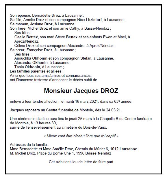 Jacques DROZ 30 avr. 1958 - 16 mar. 2021 Avis mortuaire PFG Télecharger PDF Partager sur: Galerie PreviousNext PreviousNext