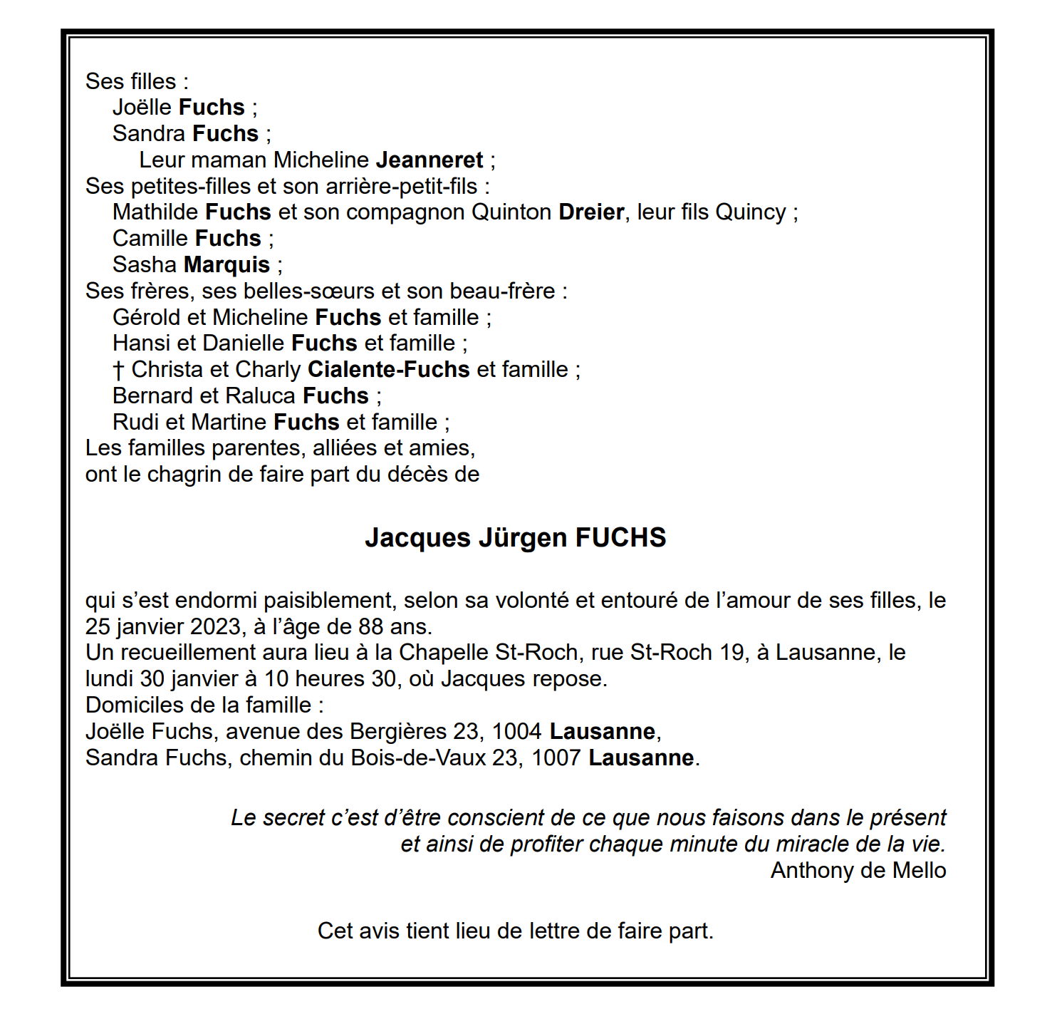 Jacques Jürgen FUCHS 18 nov. 1934 - 25 jan. 2023 Avis mortuaire PFG Télecharger PDF Partager sur: Galerie PreviousNext PreviousNext