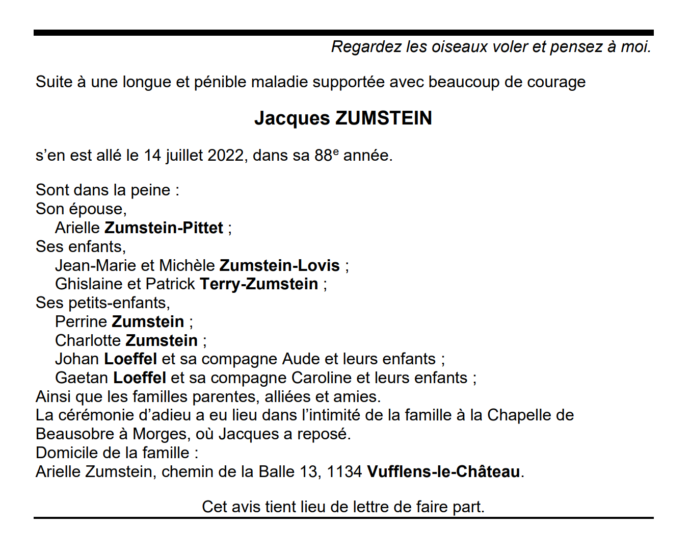 Jacques ZUMSTEIN 03 fév. 1935 - 14 juil. 2022 Avis mortuaire PFG Télecharger PDF Partager sur: Galerie PreviousNext PreviousNext