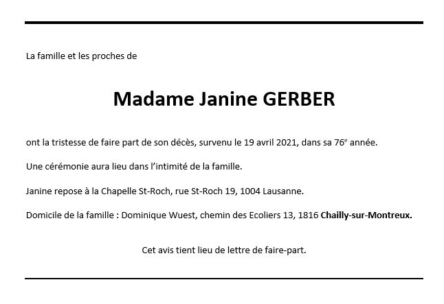 Janine GERBER 03 jan. 1946 - 19 avr. 2021 Avis mortuaire PFG Télecharger PDF Partager sur: Galerie PreviousNext PreviousNext