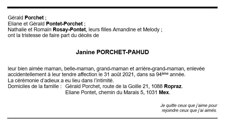 Janine PORCHET-PAHUD 12 avr. 1928 - 31 aoû. 2021 Avis mortuaire PFG Télecharger PDF Partager sur: Galerie PreviousNext PreviousNext