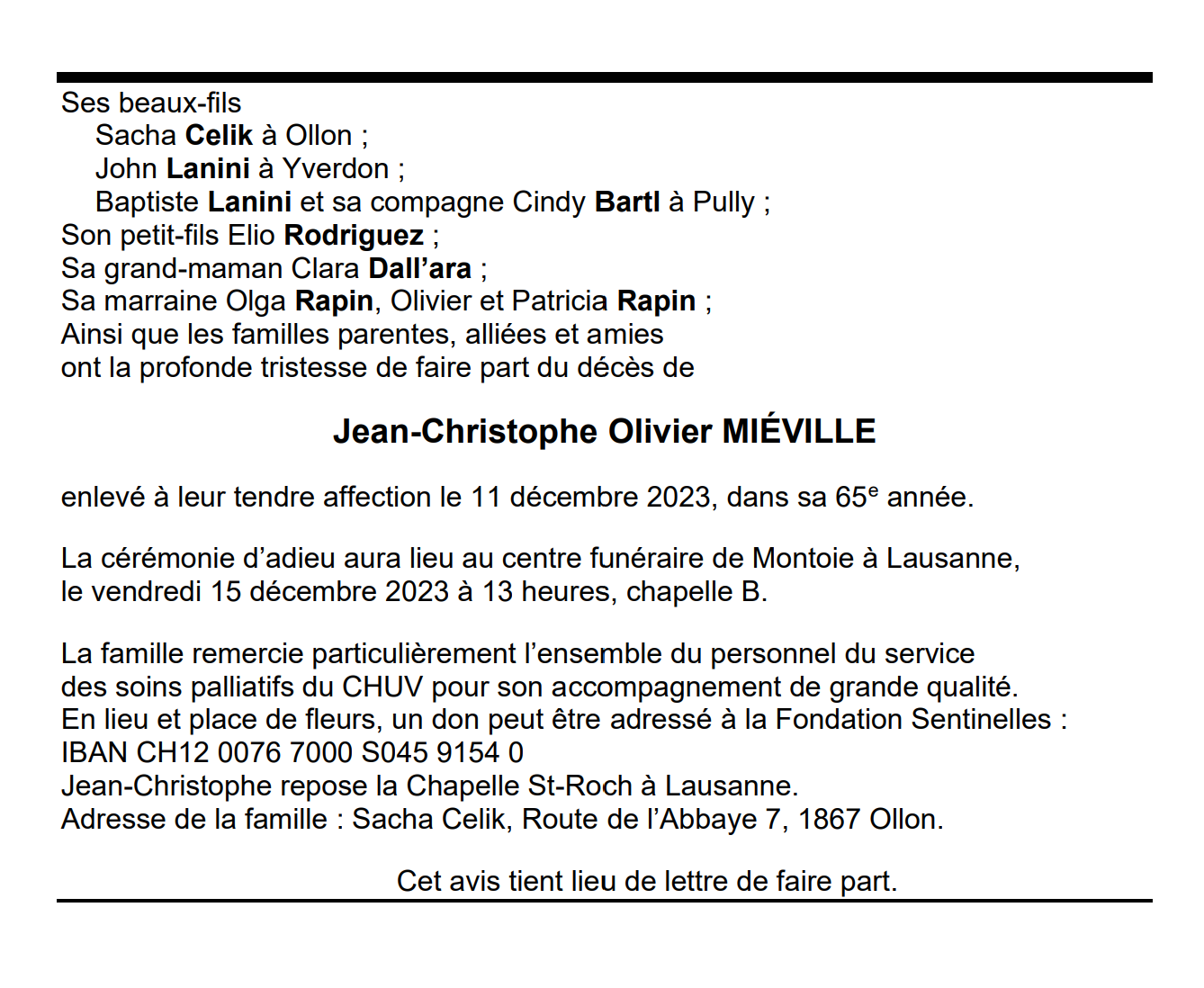 Jean-Christophe Olivier MIÉVILLE 07 jan. 1959 - 11 déc. 2023 Avis mortuaire PFG Télecharger PDF Partager sur: Galerie PreviousNext PreviousNext