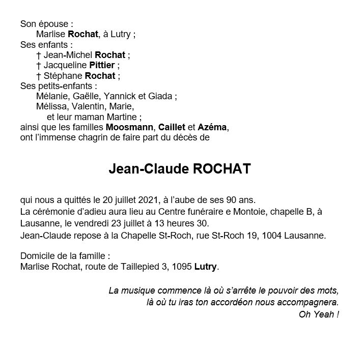 Jean-Claude ROCHAT 17 aoû. 1931 - 20 juil. 2021 Avis mortuaire PFG Télecharger PDF Partager sur: Galerie PreviousNext PreviousNext