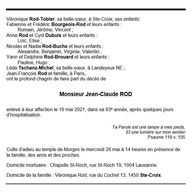 Jean-Claude ROD 08 fév. 1929 - 19 mai. 2021 Avis mortuaire PFG Télecharger PDF Partager sur: Galerie PreviousNext PreviousNext