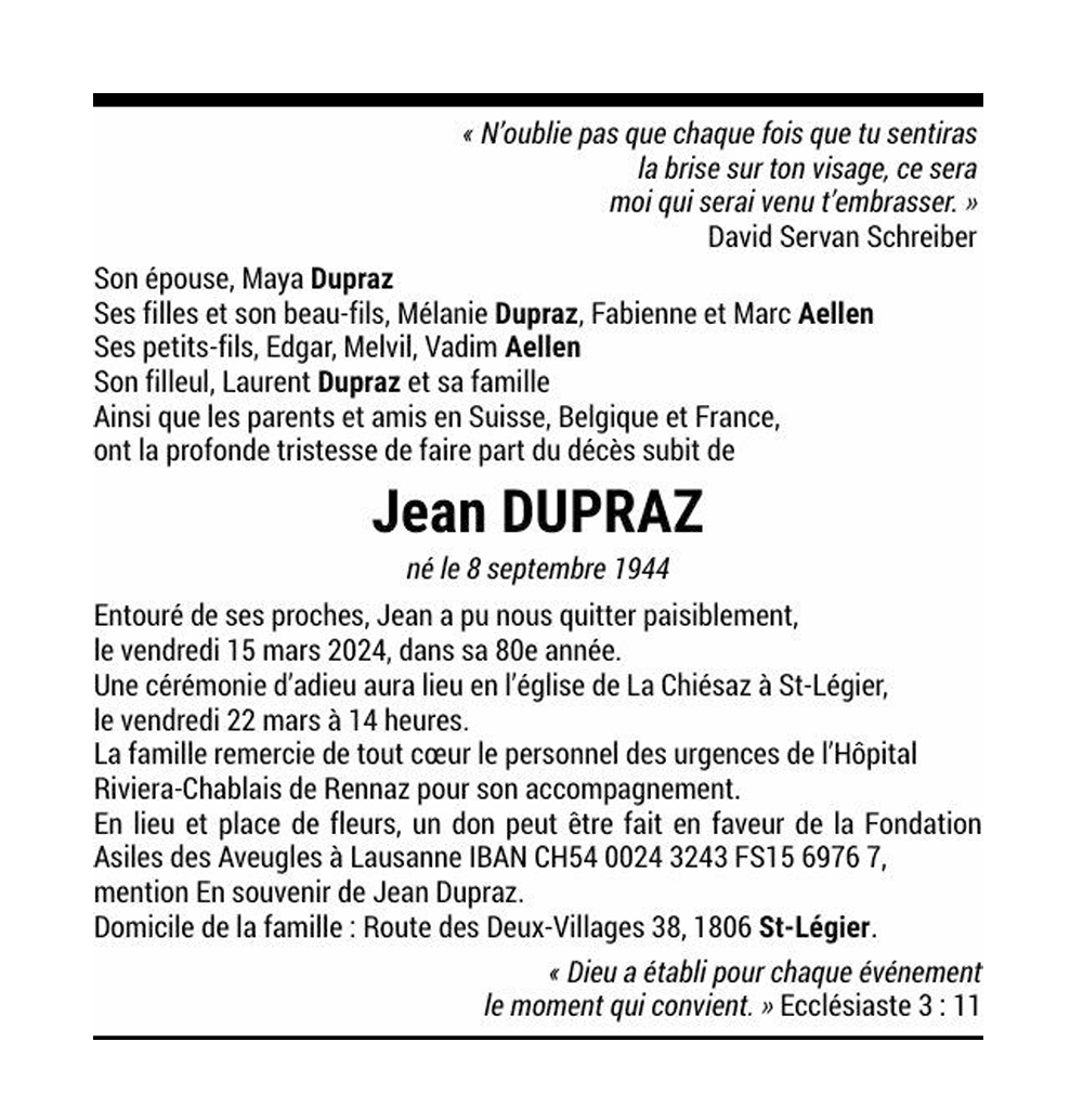 Jean DUPRAZ 20 sep. 1940 - 15 mar. 2024 Avis mortuaire PFG Télecharger PDF Partager sur: Galerie PreviousNext PreviousNext