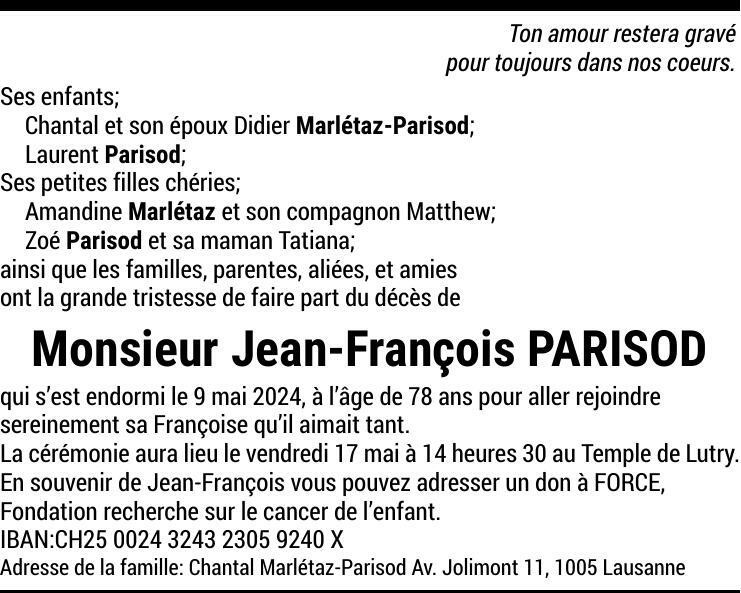 Jean-François PARISOD 27 mar. 1946 - 09 mai. 2024 Avis mortuaire PFG Partager sur: Galerie PreviousNext PreviousNext