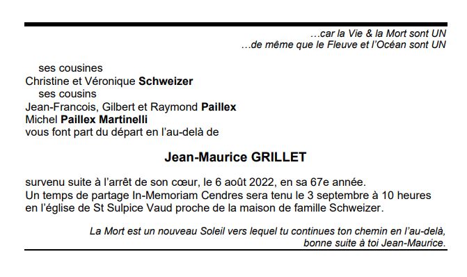 Jean-Maurice GRILLET 28 oct. 1955 - 06 aoû. 2022 Avis mortuaire PFG Télecharger PDF Partager sur: Galerie PreviousNext PreviousNext