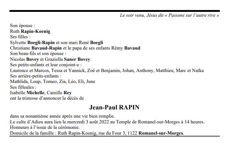 Jean-Paul RAPIN 13 fév. 1933 - 30 juil. 2022 Avis mortuaire PFG Télecharger PDF Partager sur: Galerie PreviousNext PreviousNext